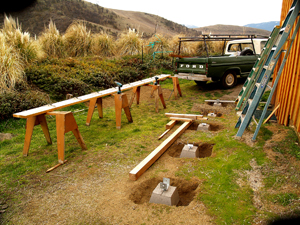 My first step was measuring and re-measuring, then hammering stakes in the ground and running level strings every which way---with horizontal string-levels hanging from them---to lay out the deck on the ground first so I would know where to dig the pier holes. After outlining the squares with fluorescent spray paint, I dug five large and fairly deep holes (44" apart) so I could wrestle the piers into them and have room to adjust their exact positions and level them before pouring concrete around them. I used piers with a hole in the top to hold adjustable brackets so I could fine tune the deck leveling process later if I needed to.