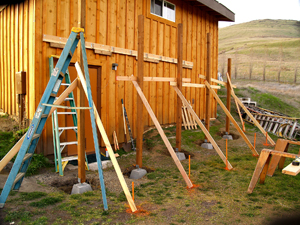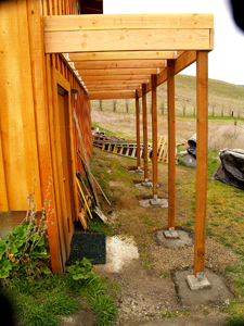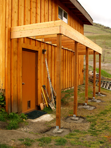 I figured the deck would not only be an attractive and useful addition to that side of the house, but also create a protected area underneath it for garden tools. It would accentuate the good features of the east side: a spectacular view, sunrises and moon rises, delicious shade in the afternoon, rainbows galore in the spring, and---being on the lee side---very little wind.