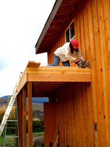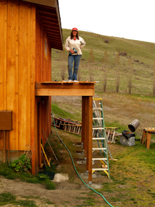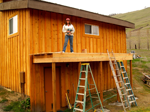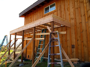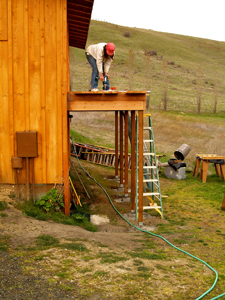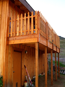 Eric's house is nestled into the side of a slope, with the basement buried on the west side but completely exposed on the east side. His kitchen is eight feet off the ground, sitting atop the basement. The entire east wall is tall, bare, and boring with nothing on it but the kitchen window twelve feet up and the basement door at ground level far over to one side. The house just didn't look balanced without a balcony deck on that side; it cried out to be built.