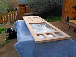 Now that the deck itself was done, it was time to cut the door opening to fit a quaint little one-of-a-kind 2-foot-wide door I bought for $50 at a builders' discount outlet. It was built from beautiful straight-grain Douglas Fir, and had a window in it to let more light into the kitchen, which made it ideal.