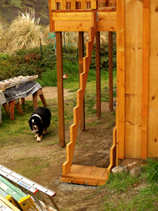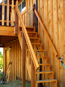 I built a little gate on the stair end of the deck and then tackled the stairs. To fit the rise and run of the space, they had to be moderately steep, but still within the safety code. They are there mainly to be used as a fire escape, so the handrails are only 27" apart, enabling a person to safely and securely hang on with both arms while going up or down. I also put traction strips on the steps---cut from inexpensive composition-roofing and screwed down with flat lath-screws.