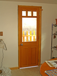I installed the door's hardware and hung it without incident. Everything fit perfectly, including the sweep on the bottom of the door as it brushed over the threshold. I used finish nails to attach molding (stops) all around the door jamb, and framed the outside of the door with siding to match the window frames.