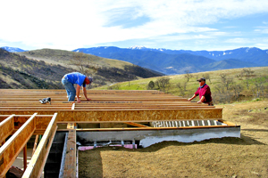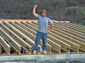 Eric worked all winter and saved enough money to buy the materials for the basement framing ($3600). The load was delivered March 3rd and his dad came up again from California to help with the 2"x6" stud-framed pony walls, BCI floor joists, and 1 1/8" T&G plywood floor. It was very important that this step in the construction was also done right. A plumb, level, and square wood foundation on top of the plumb, level, and square masonry foundation determined how geometrically perfect his house would be from here on up. I got in the act too, laying down beads of glue on the joists with a caulking gun before each of the 46 sheets of plywood were nailed down using a nail gun. We were armed and dangerous!