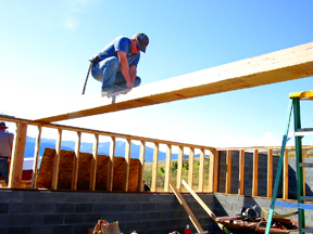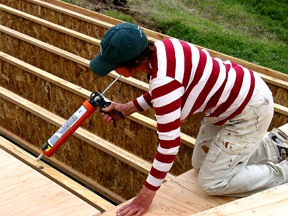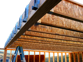 When that was done, Eric put rows of BCI blocking between the joists in the long free-spans to stabilize them and keep them evenly apart so the sheets of plywood would meet squarely at the center of each joist. (See code book for required blocking.) While Eric was doing the blocking, Ron nailed the Versa-Rims all around the perimeter of the house.