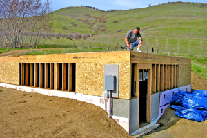 Eric's next step is to lay out his wall framing by snapping chalk lines on the painted floor...lines that correlate exactly to his floor plan on paper...and then build his walls. He'll build the stud-frame walls on the floor from 2"x6" lumber, sheath them with 4'x 8' x 5/8" OSB while they are still down to keep them square, and raise them into place one at a time with help, or by himself with wall jacks. Note: 5/8" Oriented-strand-board (OSB) is about $10/sheet and is commonly used now instead of plywood, and is code approved.
