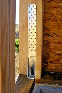 The building code now requires special earthquake and tornado protection in the form of stabilizing brackets called hold-downs on short walls near doorways. The specialized anchor bolts to secure those brackets have to be wired in place before the pour so the inspector can see them before the pour. (See photo of installed bracket.) Please note: These brackets are not to be confused with hurricane ties for rafters.
