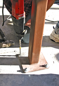 Next they turned the Versa-Beam upright and placed it exactly where it belonged, secured the post underneath, and fastened its base to the concrete floor with concrete anchor bolts.