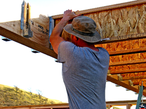 As a team we put the sheets of plywood on, staggering the joints, and glued them down to the joists. Staggering the joints means if you start the first row with a with a full sheet, start the second row with a half sheet. We used bar-clamps when the plywood tongue was reluctant to go into the groove, and sometimes had to whack the leading edge with a 5-lb. hammer (single-jack). Of course Eric used a protective T&G scrap placed on the edge to take the brunt of the pounding. The guys nailed the plywood down with the nail gun and 8d gripper nails at 6" spacing around the edges and at 12" in the field (everywhere else).