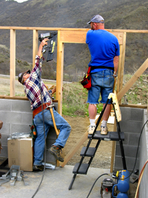When all the walls are properly aligned, put the second top-plate on, and overlap the corners alternately to tie the walls together. Eric and Ron used a spring-brace twice, a come-along once, and another method of persuasion (small sledge), to coax the walls into perfect alignment, as they permanently secured one wall to another.
