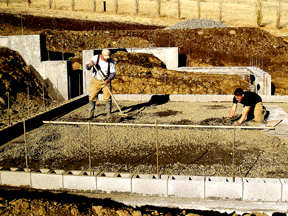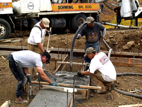 He wasted no time having the basement scooped out of his sloping rocky site with heavy equipment, and the house pad leveled for his basement floor. Then the foundation contractor took over. His crew built forms, installed rebar, and poured the footings. Before they could pour the slab floor, Eric had to put one course of blocks all around the perimeter to contain the concrete. Next day the contractor had a gravel-shooter truck come up and shoot a layer of gravel on the pad area. Then the crew installed a grid of rebar under the floor-to-be and the concrete slab was poured and finished off...to the tune of another $10,000. That wiped out his savings.