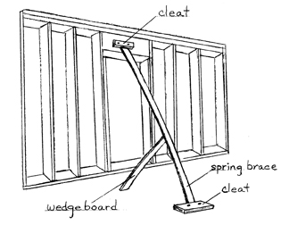 It's a good idea to temporarily cross-brace the framed walls with 1"x4"s or metal strapping to keep them square. The braces can be fastened either before or after the walls are raised. If a wall is bowed out, you can use a spring-brace to force it into plumb.(see illustration)