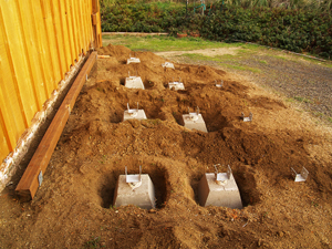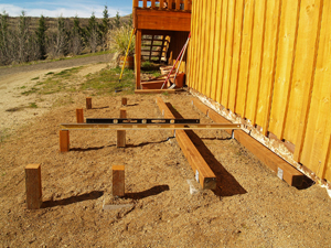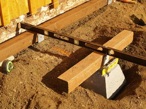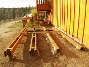 First off, I dug the pier holes deeper on the highest side of the slope and shallower on the low side. The house had been backfilled with decomposed granite so the digging was easy. Then I set 16 piers evenly spaced (4 on the long side 4-feet apart and 4 on the short side 2.5-feet apart) and screwed short posts into their brackets on the low side. I connected the posts in each row with a 12' PT (pressure-treated) 2"x6", and leveled it before attaching it. The four 12' parallel rows were also leveled with each other. To finish off the rectangular layout, I connected the ENDS of the rows with 2"x6" rim joists.