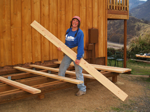 Now there were four 12' stringers (joists) 2-feet apart to fasten the deck boards across. I used (26) 8-foot 2"x6" green DF (Douglas Fir) boards for the flooring. When they dry and shrink there'll be 3/8" gaps between them to let water and stray dirt fall through as we work and irrigate inside the greenhouse. Some people prefer no floor, but we like a floor.