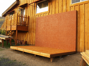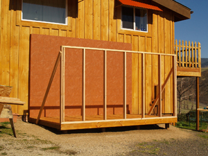 I sealed the outside of the wall with exterior paint and then raised it up and fastened it in place with 3" screws. Then I covered its front face with three more sheets of OSB and painted that too.