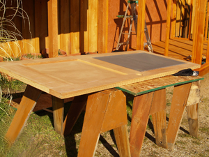 Last summer Eric grew cherry tomatoes in pots along the base of the wall. They got fried by the sun, beaten by wind, and the soil dried out too fast each day, but they miraculously produced in spite of it all. To make their life a little easier this year, we decided that an 8'x12' attached lean-to type greenhouse was the answer to those harsh conditions on the hill, and began building it in March after the winter storms subsided.