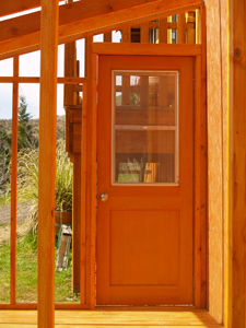 Using KD (kiln-dried) 2"x4" studs @ 2-foot centers, I framed the front wall, then the side walls, including a 30.5" wide door opening (with a 4"x4" header) on one end of the structure. I found an unusual door at the local "Builder's Bargain Center" for $89 and it was perfect for a greenhouse. The top half of the door has a dual window that can be opened by sliding the top down or the bottom up, and it was screened on the outside. I installed a threshold, then attached three hinges and a door knob set, and hung the door with a 3/16" gap all around which disappears against "stops" when closed.