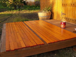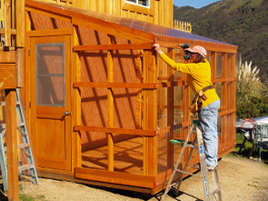 Note: Because it's a greenhouse and will be exposed inside AND out to sun, heat, and moisture on a daily basis, it's a good idea to stain all framing members as you are putting them up (before each step). It's not only easy and practical to do in advance, but looks pretty too. I used Superdeck's "Waterborne" red-cedar stain, which is resin-based but odorless and can be cleaned up with water. The product turned out to be so fantastic, I'll never use stinky petroleum-based stains again!