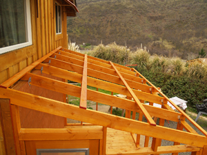 I used seven 2"x6" x 8-foot rafters spaced two feet apart and deeply notched at both ends to keep the roof low and stable at a 15-degree pitch. Brackets hold them securely in place.