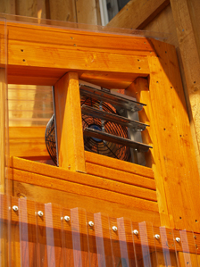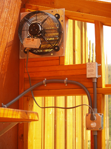 I chose the recommended size fan (10" dia. @ 1500 rpm) that moves 800 cfm of air (cubic feet per minute) which is the size of the greenhouse. I hard-wired it in so it's connected to a switch inside the greenhouse and a breaker in the electrical panel nearby. (They DO make fans with plug-in cords so that's an option.) I wired in an adjustable thermostat so the fan will go on when the temperature inside reaches 80 degrees.
